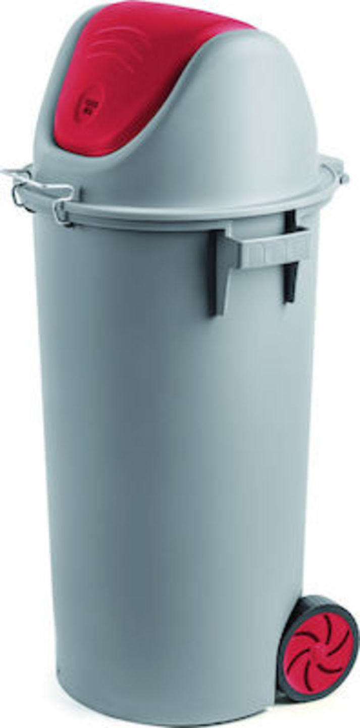 Γκρι κάδος με αιωρούμενο καπάκι κοκκινο και ρόδες 80 L ΚΠ85Κ
