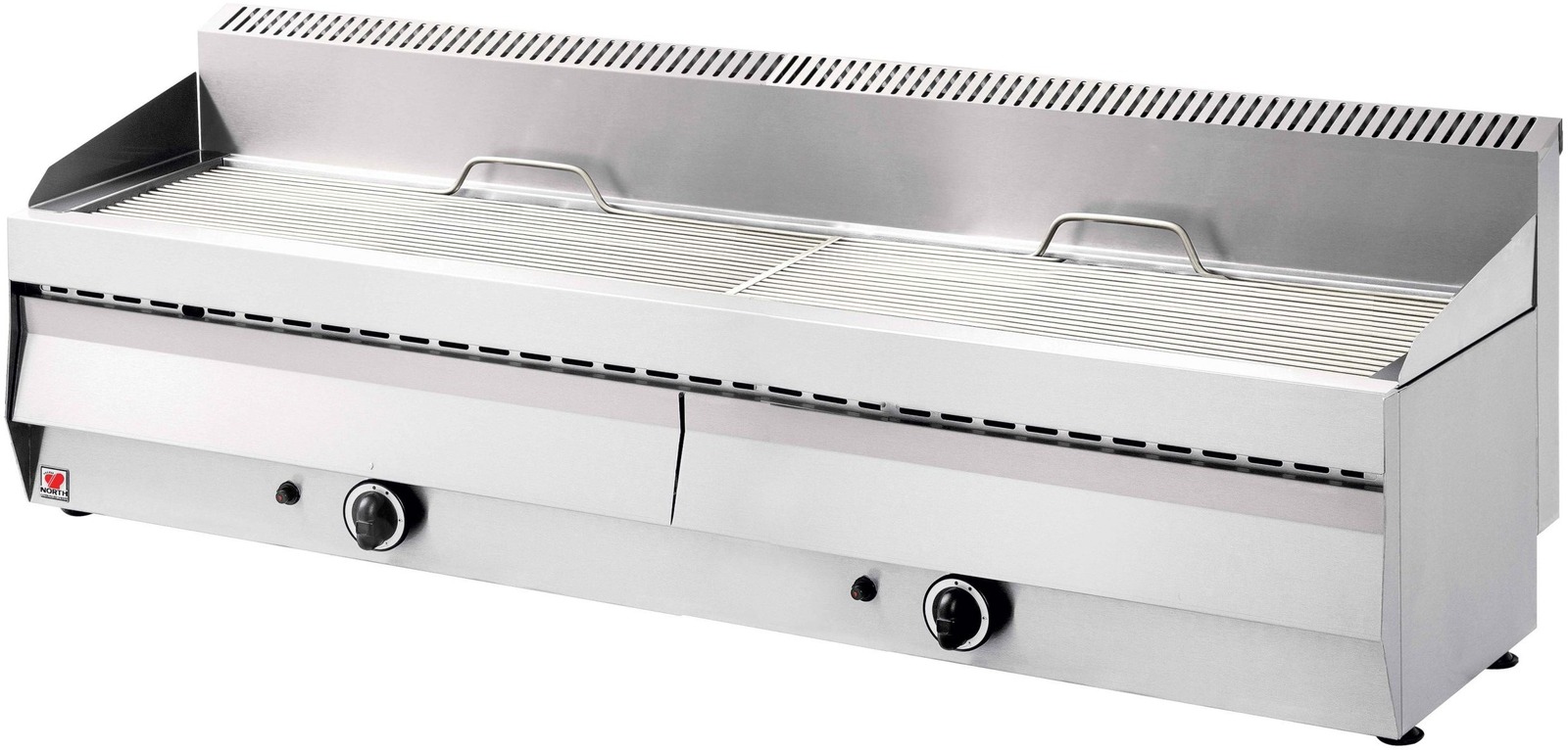 Επιτραπέζια Σουβλακίερα αερίου με συρτάρι νερού. Χάρη στους στιβαρούς και ισχυρούς σε ισχύ ανοξείδωτους καυστήρες η επιφάνεια ψήσεως είναι έτοιμη σε μικρό χρονικό διάστημα προς χρήση.