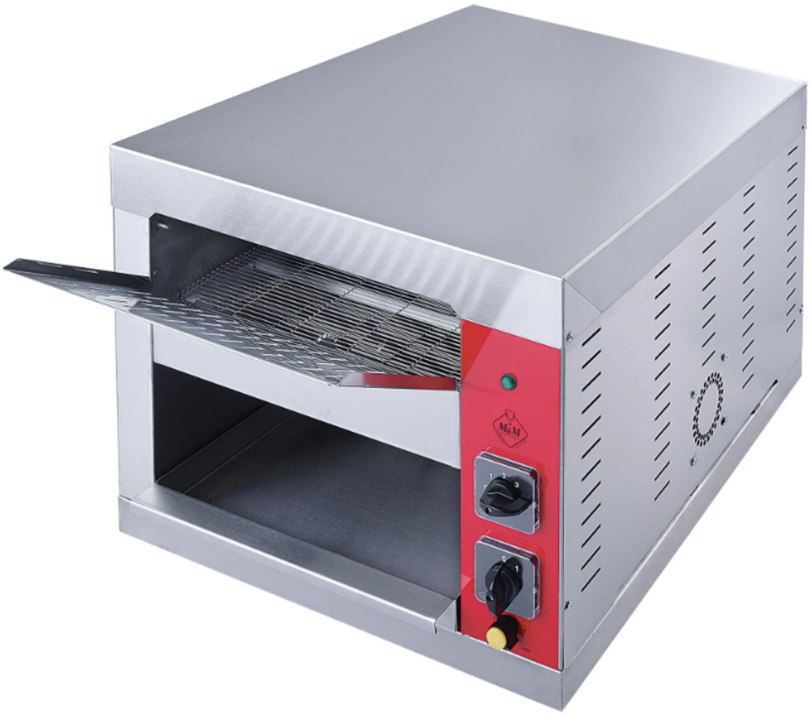 Φρυγανιέρα αλυσίδας με γενικό διακόπτη λειτουργίας, ενδεικτική λυχνία , ανοξείδωτη αλυσίδα μεταφοράς , ρυθμιζόμενη ταχύτητα αλυσίδας ,αναδιπλούμενη πίσω πόρτα εξόδου προιόντων, επιλογή λειτουργίας μερικών ή όλων των αντιστάσεων (ανάλογα με τη χρήση) και συρτάρι περισυλλογής.